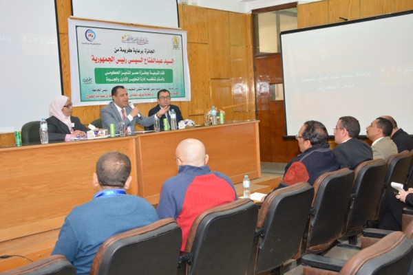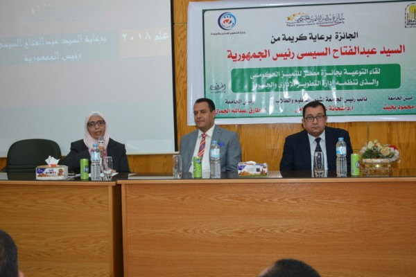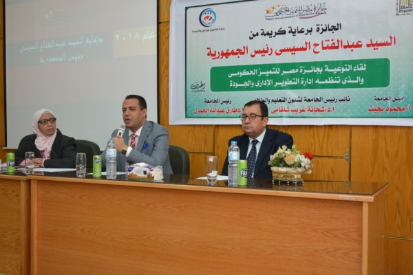 جاء ذلك خلال افتتاح فاعليات " لقاء التوعية بجائزة مصر للتمييز الحكومى و الذى تنظمه إدارة التطوير الادارى و الجودة فى كلية الحاسبات بالجامعة ، و ذلك تحت رعاية الدكتور طارق الجمال رئيس الجامعة ، وبحضور الدكتورة تيسير حسن عبد الحميد عميدة كلية الحاسبات و المعلومات ، والدكتور مرغنى حسن وكيل الكلية لشئون التعليم و الطلاب و الأستاذ محمود بخيت أمين عام الجامعة و الأستاذ محمد عباس مدير إدارة التطوير الادارى و الجودة ومنسق الجائزة بالجامعة ، ولفيف من السادة أعضاء هيئة التدريس و العاملين بكلية الحاسبات .