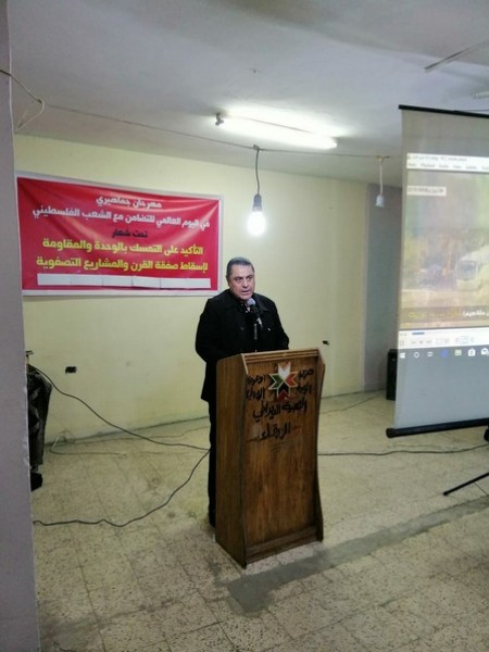 دعا عضو اللجنة المركزية العامة للجبهة الشعبية إياد عوض الله لضرورة بذل الجهود لتوسيع وتعميق أشكال وحالة التضامن الدولي مع شعبنا وحقوقه الوطنية من خلال صوغ استراتيجية موحدة تعمل على معاقبة مجرمي الحرب الصهاينة، وتوسيع مظاهر مقاطعة إسرائيل، والضغط من أجل تنفيذ كافة قرارات الشرعية الدولية ذات الصلة بالحقوق الفلسطينية.