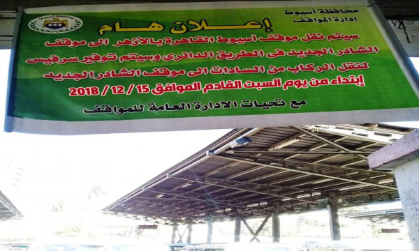 أعلن اللواء جمال نور الدين محافظ أسيوط عن نقل موقف سيارات " أسيوط/ القاهرة " بعدد (274) ميكروباص إلي موقف الشادر الجديد إتجاه الكوبري العلوي بالطريق الدائرى بجوار مزلقان السكة الحديد بالمعلمين يوم السبت القادم وتخصيص سيارات سرفيس لنقل الركاب من موقف السادات / الأربعين بعدد 38 أوتوبيس وميكروباص كمرحلة أولي تمهيداً لنقل باقي المواقف الأخري وذلك نظراً لتكدس السيارات والزحام الشديد بموقف الأزهر وعدم إستيعابه جميع سيارات مواقف مراكز بحري أسيوط وبعض المحافظات.