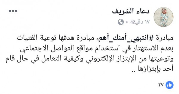 أطلق فريق شبابي مبادرة إلكترونية توعوية بعنوان (انتبهي أمنك أهم) لتسليط الضوء على جرائم الابتزاز الالكتروني وسوء استخدام مواقع التواصل الاجتماعي وذلك برعاية وزارة شؤون المرأة وبتمويل من صندوق الأمم المتحدة للإسكان (UNFPA).