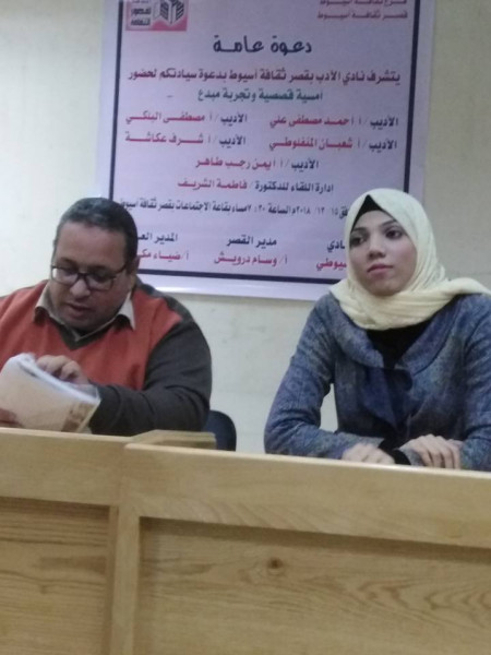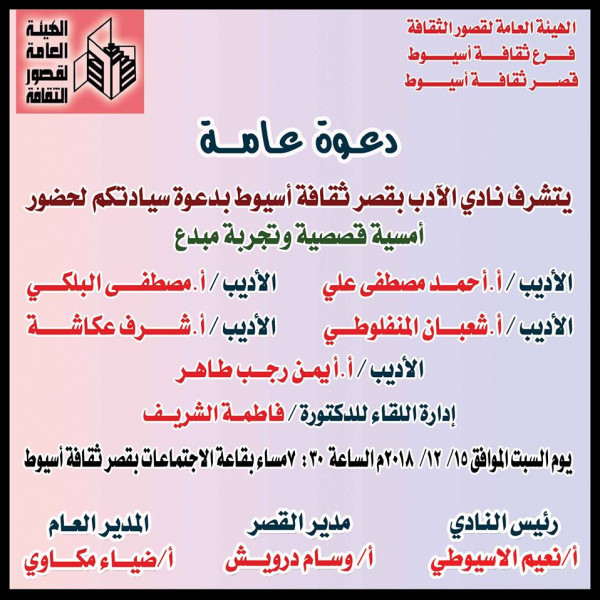 نظم نادي أدب قصر ثقافة أسيوط لقاءًا بعنوان "تجربة مبدع" مساء اليوم بقاعة التذوق في قصر ثقافة أسيوط التابع للهيئة العامة لقصور الثقافة صرح بذلك الكاتب نعيم الأسيوطي رئيس نادي أدب أسيوط وقال إن الندوة ادارتها الدكتورة فاطمة الشريف.