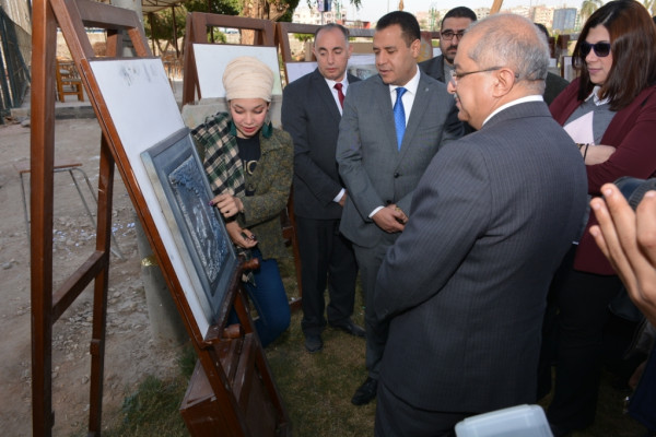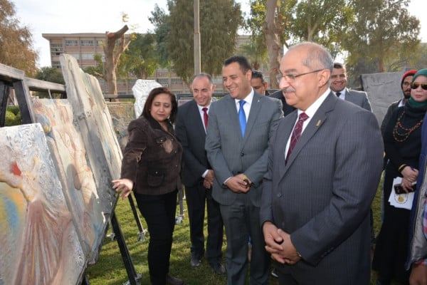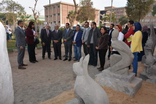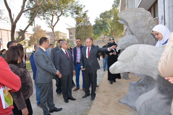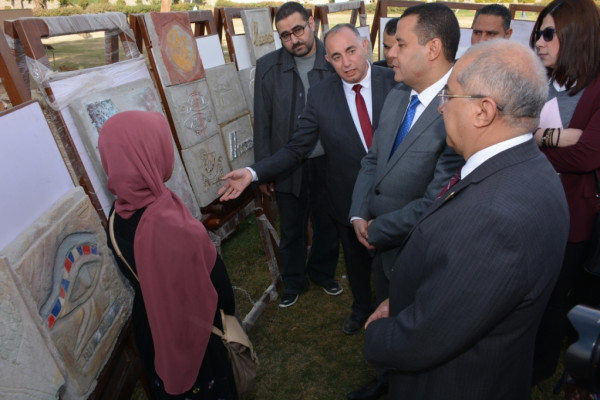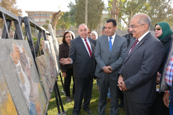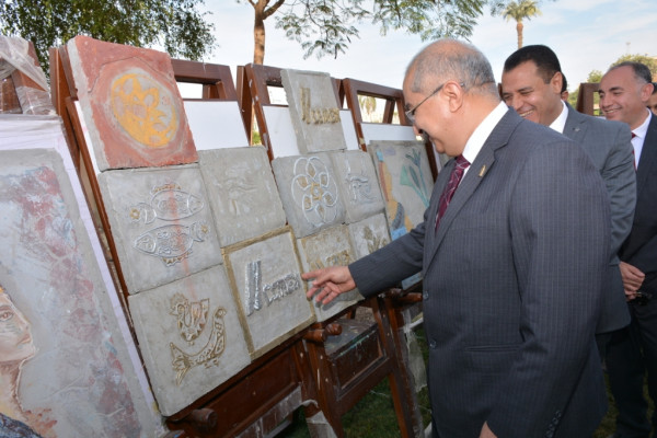 حيث قام رئيس جامعة أسيوط بتفقد معرض الأعمال الفنية المقام على هامش الحفل والذى يتضمن عدداً من الأعمال الفنية المميزة والذى صممها ونفذها الطلاب بإستخدام الأسمنت وذلك لأول مرة وهو ما يعد خروجاً عن إستخدام الأدوات التقليدية والشائعة فى ذلك المجال.