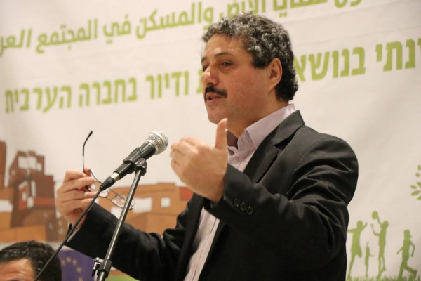 وبالنسبة للبناء فالمواطن العربي يبني على ارضه الخاصة ولا تقوم الدولة بتوزيع الأراضي التي بملكيتها وإتاحة البناء عليها للمواطن العربي بشكل كافٍ. وبالنسبة للنقب فتعاني المجالس الإقليمية المعترف بها واحة الصحراء والقسوم من تضييق الخناق على سكانها، بينما تسيطر المجالس الإقليمية اليهودية على مساحات شاسعة تصل الى ملايين الدونمات. وتطرق الى شق المقاطع الجديدة لشارع رقم 6 في النقب، وسيطرة ما يسمى بـ"سلطة تطوير البدو" على كل الجوانب الحياتية لسكان النقب العرب، وتكريس سياسة التهجير والاقتلاع.