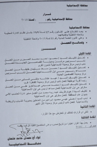 محافظ الاسماعيلية يصدر قرارا بإجراء تغيرات وتنقلات جديدة لنواب المراكز والمدن والأحياء