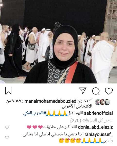 الفنانة رانيا يوسف، استغلت أداء الفنانة صابرين لمناسك العمرة في مكة المكرمة وطلبت منها الدعاء لها ولبناتها.. حيث علقت على صورة نشرتها الفنانة صابرين من أمام الكعبة داخل الحرم المكى عبر حسابها على انستجرام، قائلة: "ربنا يتقبل ياحبيبتي.. ادعيلى أنا وبناتى والنبى".