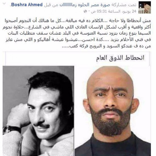 بشرى، علقت على الصورة قائلة: "مش انحطاطا ولا حاجة ...الكلام ده فيه مبالغة... كل ما هنالك أن النجوم أصبحوا أكثر واقعية و أقرب لشكل الإنسان العادي اللي ماشي في الشارع".