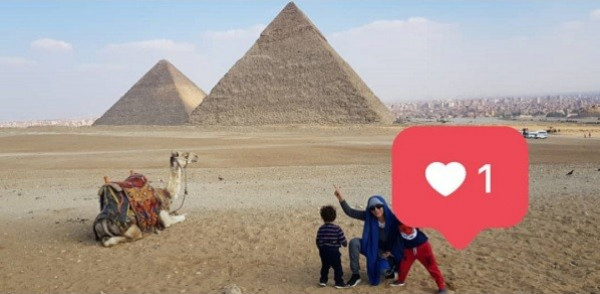 النجمة المصرية التقطت عدد من الصور مع ابنيها، إلا أنها حرصت على إخفاء وجهيهما، وظهرت في إحدى الصور وهي على ظهر جمل وأمامها ابنها سليم.