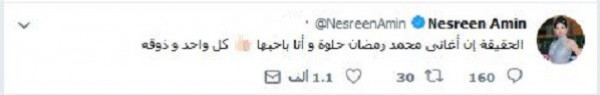 نسرين أمين، وبحسب مجلة "جلولي" دافعت عن الفنان محمد رمضان، في تغريدة عبر صفحتها الشخصية بموقع "تويتر"، بعد طرح الأغنية عبر موقع "يوتيوب"، قائلة: "الحقيقة أن أغاني محمد رمضان حلوة وأنا بحبها، كل واحد وذوقه".