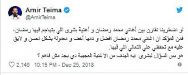 وأضاف: "هو بس السؤال لبشرى: إيه الهدف من الأغنية العجيبة دي بجد مش فاهم؟".