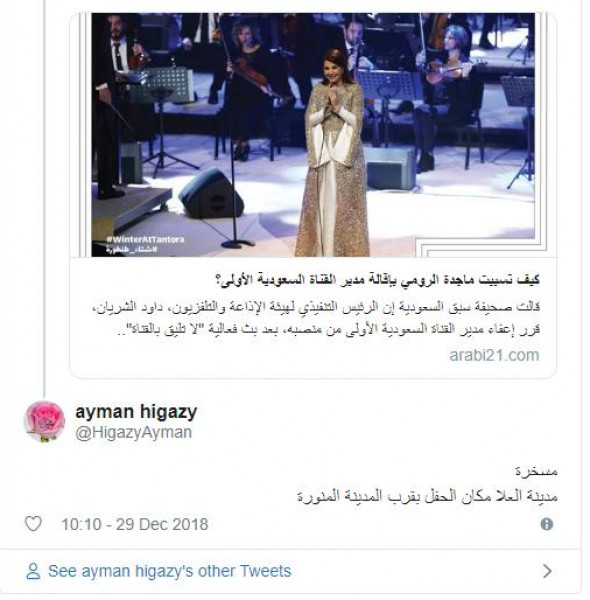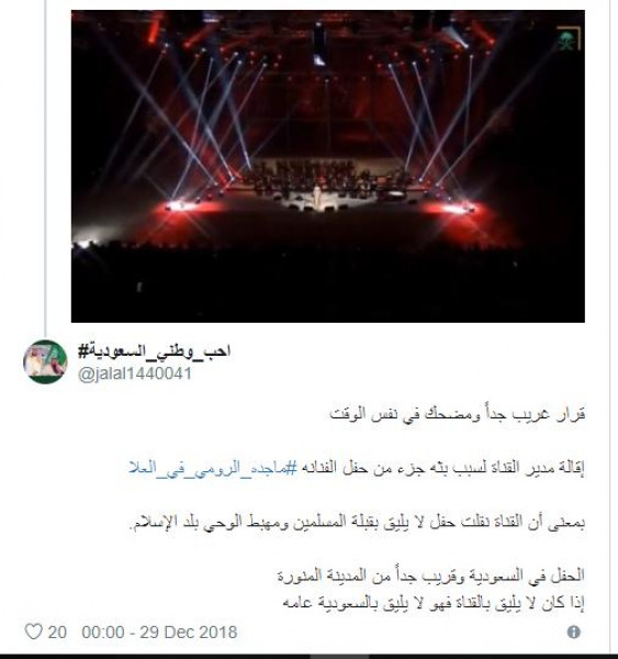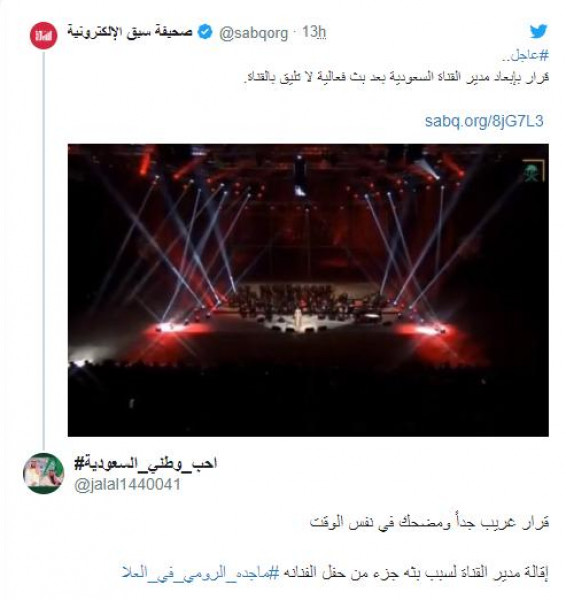 وأثار قرار الشريان استغراب الكثيرين، ممن أثارهم إقالة مدير القناة الأولى بسبب نقل الحفل، دون الإشارة للحفل ذاته المقام بالقرب من المدينة المنورة .