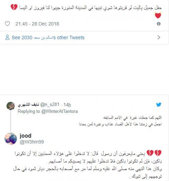 ولفت نشطاء تواصل إلى أن المكان المقامة عليه الحفلات، هي منطقة عذاب مدائن النبي صالح، والتي استشهد مغردون بأحاديث نبوية عن ضرورة عدم الإقامة فيها مطولا والمشي منها بصورة سريعة.