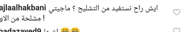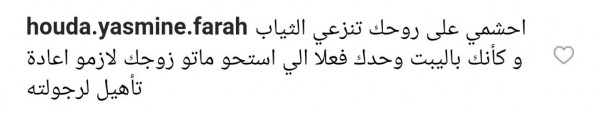 وقالت أخرى: "احشمي على روحك تنزعي الثياب وكأنك بالبيت وحدك؟ فعلًا إلي استحو ماتو، زوجك لازمو إعادة تأهيل لرجولته".