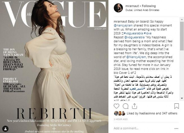 على الرغم من تقدمها في شهور الحمل، ظهرت النجمة اللبنانية نانسي عجرم على غلاف مجلة "فوغ" vogue الفرنسية بنسختها العربية، وهي ترتدي ملابس أنيقة أظهرت بطنها المنتفخ.
