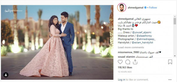 وعلّق جمال على الصورة التي نشرها عبر حسابه الشخصي على "إنستغرام" قائلًا: "جمهوري الغالي حبيت أشارككم فرحتي وعقبالكم يارب.. أحمد وديانا".