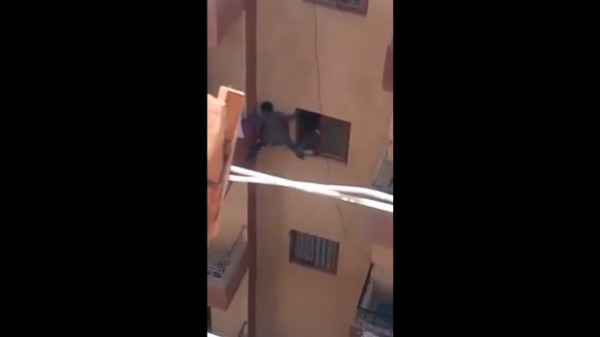 حيث ظهر في المقطع الذي التقطه أحد الجيران طفلا يتدلى بشكل خطير من نافذة منزل مجاور باتجاه شرفة البيت على ارتفاع طابقين، بينما كانت الأم تدفعه دون رحمة ليصل إلى الشرفة وفتح الباب بعد نسيانها للمفتاح عند خروجها من البيت، وبدت غير آبهة بصراخه وخوفه الشديدين.