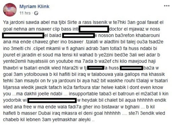 وكانت الحرب بين ميريام ونادين "ولعت" بسبب اتهام ميريام لـ نادين بالمساهمة في منع كليب أغنيتها Goal ومؤخراً علقت نادين الراسي في أحد البرامج التلفزيونية على هذا الأمر حيث تحدثت بأن أغنية ميريام فيها إيحاءات جنسية وأنها تستغل الطفولة في هذا الأمر، ولم تنتظر ميريام كلينك طويلاً بل ردت عليها في صفحتها الرسمية على أحد مواقع التواصل الاجتماعي واصفة إياها بـ"الجردونة السودا" وسردت عدداً من الفضائح حسب ما كتبت كلينك متهمة نادين بالقيام بأعمال مخلّة بالآداب في البترون، وختمت "إستحي عندك اولاد، شباب كل لبنان عم يتمسخر عليكي".