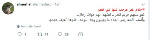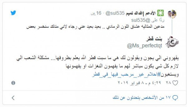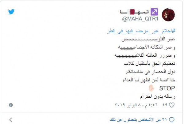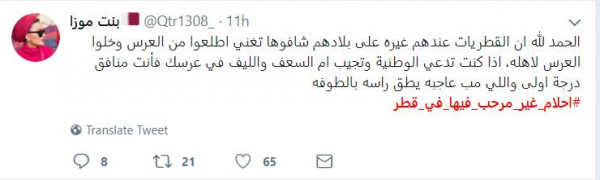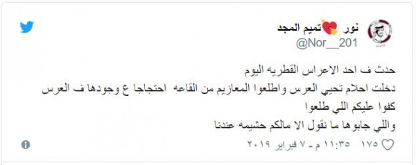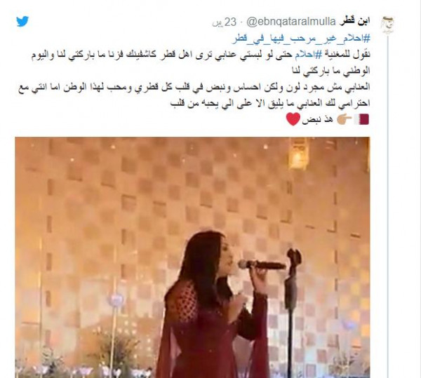 وقال: "حدث في أحد الأعراس القطرية اليوم ، دخلت أحلام تحيي العرس واطلعوا المعازيم من القاعه احتجاجا ع وجودها ف العرس ، كفوا عليكم اللي طلعوا ، واللي جابوها ما نقول الا مالكم حشيمه عندنا".