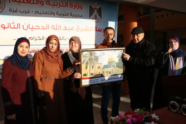 كما قدمت جامعة غزة هدية لمديرة المدرسة بمناسبة الافتتاح عبارة عن برواز لصورة مدينة القدس عاصمة دولة فلسطين الأبدية.