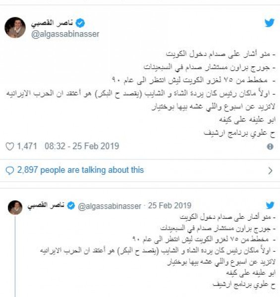 وغرد القصبي، عبر موقع (تويتر)، قائلًا: "- منو أشار على صدام دخول الكويت- جورج براون مستشار صدام في السبعينات - مخطط من 75 لغزو الكويت ليش انتظر إلى عام 90".