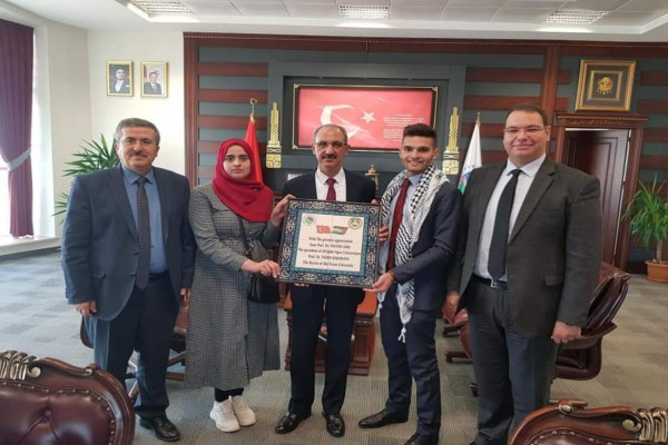 كرّم الطالبان أحمد سمير ياسين، وإيمان طالب أبو نعيم،الموفدان من كلية الزراعة بجامعة القدس المفتوحة للدراسة لمدة فصل إلى جامعة "آهي أفران" التركية، رئيس الجامعة التركية أ. د. فتان كاراكايا.