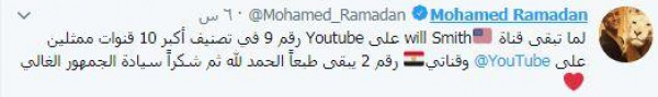 وكتب رمضان: "لما تبقى قناة will Smith على يوتيوب رقم 9 في تصنيف أكبر 10 قنوات ممثلين، وقناتي رقم 2، يبقى طبعا الحمد لله، ثم شكرا سيادة الجمهور الغالي".