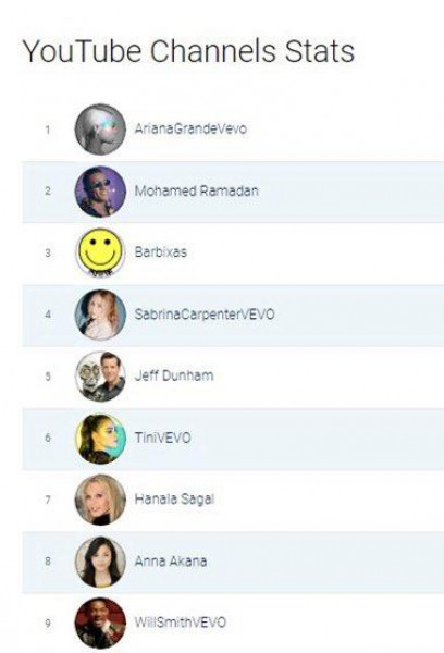وحل رمضان في المركز الثاني بعد إريانا جراندي، أكثر نجوم الفن شهرة على موقع يوتيوب، بينما حل الفنان ويل سميث في المركز التاسع، وفقا لموقع "youtube channel stats".