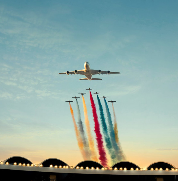 قاد طائرة الاتحاد للطيران الكابتن ريتشارد دايسون والكابتن عادل الزبيدي، فيما استلم الكابتن كيان سيو بيه مهمة صعبة ألا وهي الحرص على اتباع توقيت مراحل العرض لحظة بلحظة.