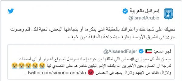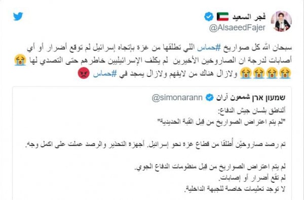أشاد حساب الخارجية الإسرائيلية على تويتر، بالإعلامية الكويتية فجر السعيد، بعد سخريتها من صواريخ "حماس".