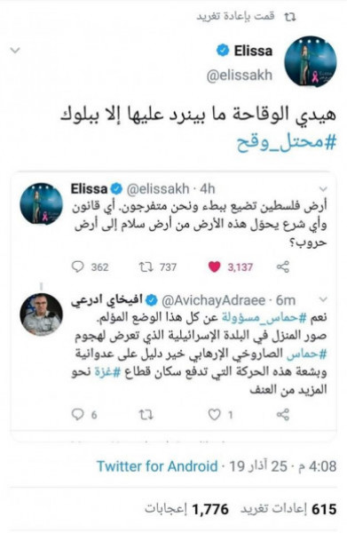 وكانت اليسا اعتبرت في تغريدة مساء يوم الاثنين، أن "أرض فلسطين تضيع ببطء، ونحن متفرجون، أي قانون وأي شرع يحول هذه الأرض من أرض سلام إلى أرض حروب؟"، فردّ أدرعي محملاً حركة حماس مسؤولية الأحداث الاخيرة، ما دفع اليسا الى وصفه بالمحتل الوقح، وحظر حسابه.