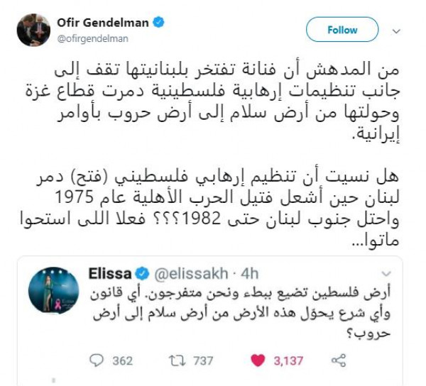 بعد السجال الذي انتهى بحظر الفنانة اللبنانية، إليسا لحساب أفيخاي ادرعي المتحدث باسم الجيش الاسرائيلي عبر "تويتر"، على خلفية تغريدتها حول فلسطين، دخل اوفير جندلمان المتحدث باسم رئيس الوزراء الإسرائيلي بنيامين نتنياهو، على خط السجال.
