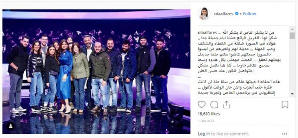 ونشرت "الفارس" صورة لها مع فريق العمل، مرفقة بتعليق اكتفت من خلاله بشكر فريق العمل والإدارة، مضيفة أنها تعمل على هذا المشروع منذ عام كامل.