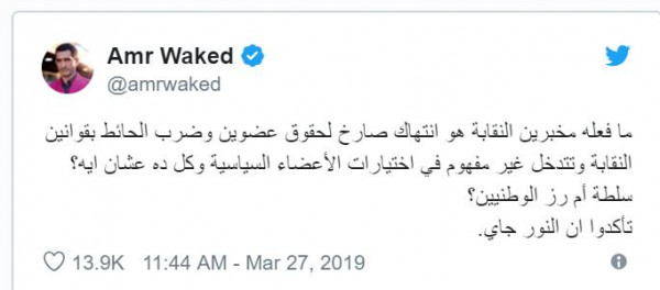 وأضاف: "ما فعله مخبرين النقابة هو انتهاك صارخ لحقوق عضوين وضرب الحائط بقوانين النقابة وتتدخل غير مفهوم في اختيارات الأعضاء السياسية وكل ده عشان ايه؟ سلطة أم رز الوطنيين؟ تأكدوا ان النور جاي.
