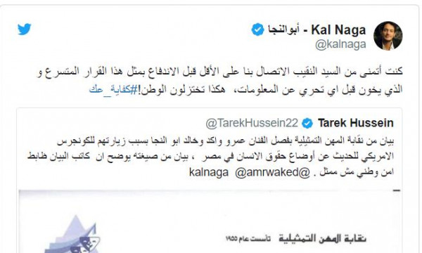 أما خالد أبو النجا غرد عبر حسابه الشخصي بموقع تويتر، إنه كان يتمنى من السيد النقيب الاتصال "بنا" —أي هو وعمر واكد- قبل الاندفاع بمثل هذا القرار المتسرع.
