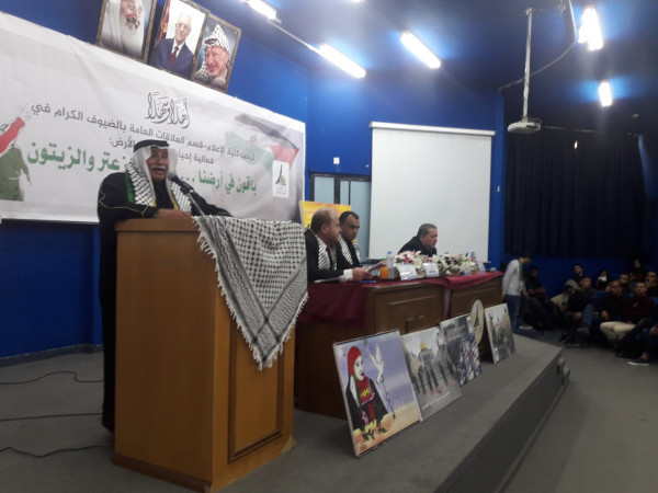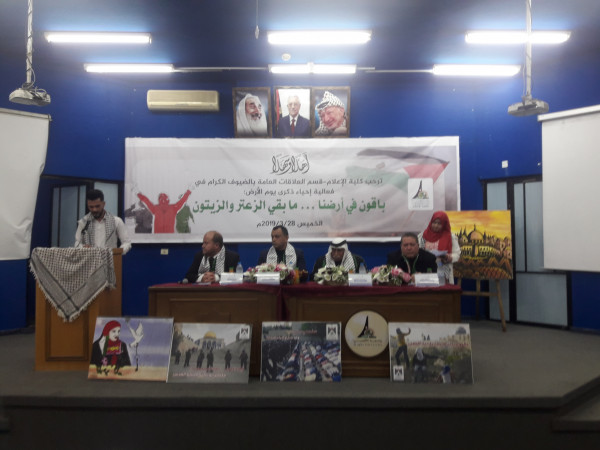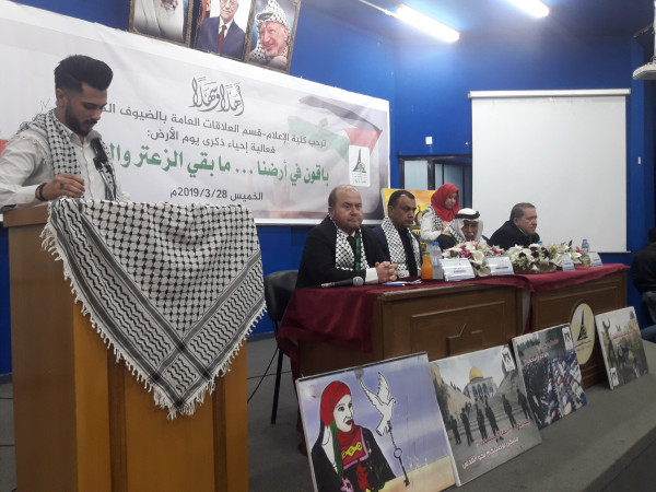 جاء ذلك خلال ندوة عقدها قسم العلاقات العامة بكلية الإعلام في جامعة الأقصى بمناسبة ذكرى يوم الأرض، تحت عنوان "باقون في أرضنا.. ما بقي الزعتر والزيتون"، في قاعة المؤتمرات وسط حضور عميد كلية الإعلام د. ماجد تربان، ورئيس قسم العلاقات العامة بالكلية د. أحمد حماد، ورئيس مجلس عشائر البادية الشيخ أبو أسامة الزريعى، وحشد من مخاتير ووجهاء مجالس البادية، ولفيف من الشخصيات الاجتماعية وطلبة الجامعة.