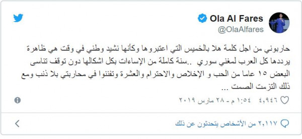 وقالت الفارس في تغريدة على حسابها بـ "تويتر": "حاربوني من أجل كلمة هلا بالخميس التي اعتبروها وكأنها نشيد وطني في وقت هي ظاهرة يرددها كل العرب لمغنٍ سوري.. سنة كاملة من الإساءات بكل أشكالها دون توقف تناسى البعض 15 عامًا من الحب و الإخلاص والاحترام والعشرة وتفننوا في محاربتي بلا ذنب ومع ذلك التزمت الصمت".