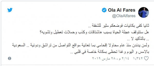 وذكرت الفارس في تغريدة ثالثة: "كفى بكائيات فوضعكم مثير للشفقة.. هل ستتوقف عجلة الحياة بسبب هاشتاقات وكذب وحملات تعطيل وتشويه؟ .. بالتأكيد لا .. ولمن يدندن منذ عام محاولًا إقحامي بما تعانيه مواقع التواصل من تراشق ودونية.. السعودية بالأمس واليوم وغدًا تحظى بمكانة خاصة في قلبي".