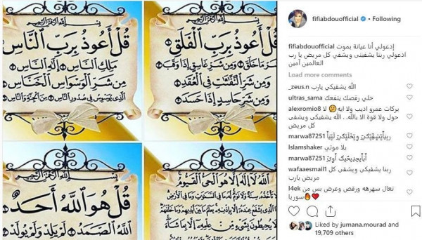 وكانت فيفي عبده قد نشرت مجموعة صور لآيات قرآنية، عبر حسابها الرسمي في موقع "انستجرام"، وطلبت من جمهورها الدعاء لها بالشفاء العاجل، بقولها: "إدعولي أنا عيانة بموت، إدعولي ربنا يشفيني ويشفي كل مريض يا رب العالمين".