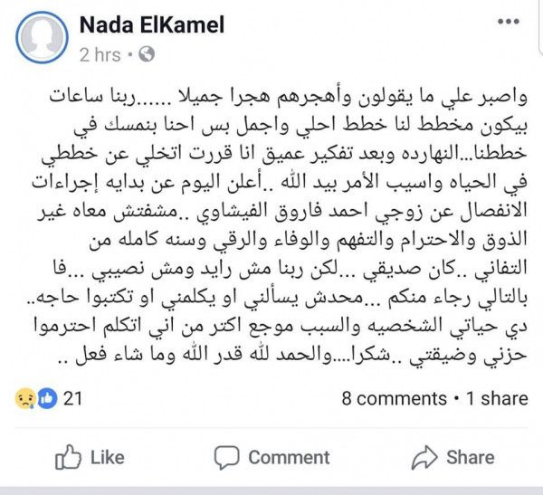 وأثار ما قام به الفيشاوي التساؤلات بين المتابعين وفتح باب التكهنات حول انفصالهما، في حين تداول آخرون منشورًا لندى الكامل، عبر حسابها على "فيسبوك"، بأنها قررت الانفصال عن زوجها أحمد الفيشاوي.