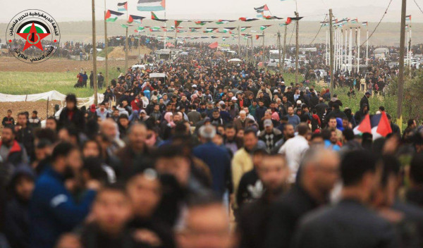 وأشادت الجبهة بالمشاركة الواسعة في مليونية الأرض والعودة، في تأكيد على تمسك شعبنا الفلسطيني بأرضه وحقوقه الوطنية، واستمرار مسيرات العودة وكسر الحصار حتى تحقق أهدافها.
