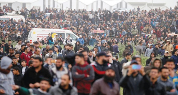 وكان عشرات الآلاف من المواطنين توافدوا منذ ساعات الصباح لمخيمات العودة, يتقدمهم قادة فصائل العمل الوطني الفلسطيني المقاوم.