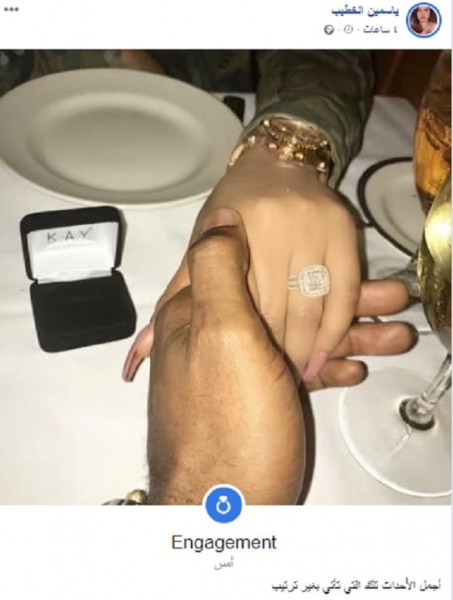 ياسمين علقت على الصورة بقولها: "أجمل الأحداث تلك التي تأتي بغير ترتيب"، وغيرت الحالة الاجتماعية على "الفيس بوك" إلى "مخطوبة".