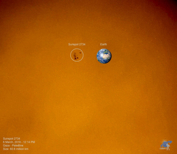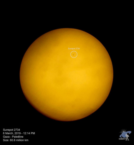 تمكن فريق الرصد التابع لمركز أبحاث الفضاء والفلك في جامعة الأقصى، من رصد وتوثيق البقعة الشمسية رقم (AR2738).كما قام الفريق بمقارنة رياضية ومعالجة محوسبة لتوضيح الفرق في الحجم بين البقعة الشمسية التي تم رصدها هذه الليلة مع حجم كوكب الأرض، حيث إن قطر البقة يبلغ 45256 كم مقارنة بقطر الأرض البالغ 12756 كم.