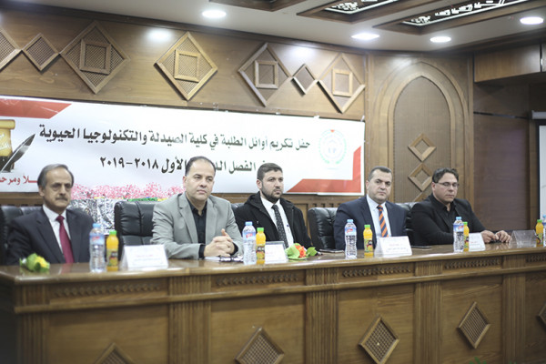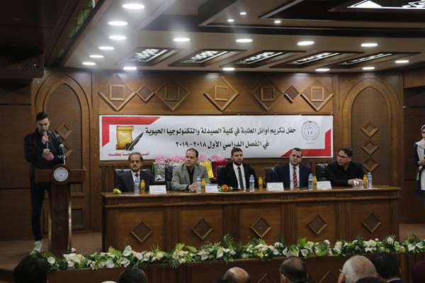 نظمت كلية الصيدلة والتكنولوجيا الحيوية بجامعة فلسطين حفل تكريم لطلبتها المتفوقين في الفصل الدراسي الاول من العام الجامعي 2018/2019م، في قاعة القدس بمقر الجامعة الرئيس بمدينة الزهراء، بحضور الدكتور محمد أبو سعدة عميد الشؤون الاكاديمية والدكتور نادر أبو شرخ مساعد رئيس الجامعة للشؤون الأكاديمية، والدكتور أكرم عطا الله عميد الكلية ، والدكتور نهاد بدرية عميد شؤون الطلبة، وكافة رؤساء الأقسام في الكلية، ولفيف من الشخصيات الاعتبارية والهيئتين الإدارية والأكاديمية والطلبة المحتفى بهم وذويهم.