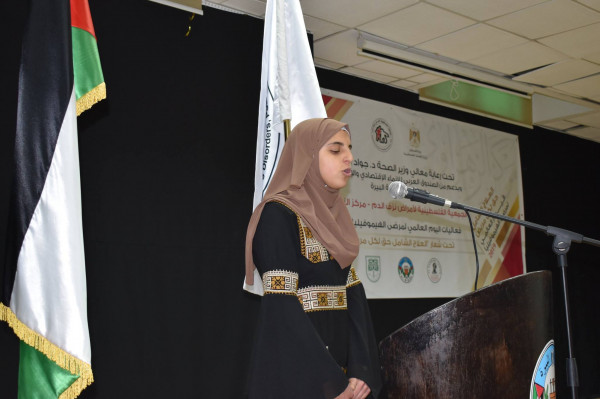 عضو المجلس البلدي لبلدية البيرة تمارا حداد ونيابة عن رئيس البلدية السيد عزام اسماعيل خلال كلمة لها أثنت على جهود الجمعية الفلسطينية لامراض نزف الدم في دعم وحماية ورعاية المرضى مؤكده دعم البلديه لجميع أنشطة وفعاليات الجمعية وخاصة بعد توقيع مذكرة تفاهم بين البلدية والجمعية مؤخرا.