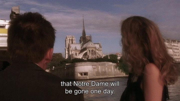 وخلال المشهد، يظهر بطلا الفيلم إيثان هوك وجولي دلبي، على متن مركب سياحي حيث تبادلا الحديث، حول محاولة تفجير كنيسة "نوتردام"، من قبل الألمان أثناء الحرب العالمية وتوزيع المتفجرات في جميع أنحاء المبنى.
