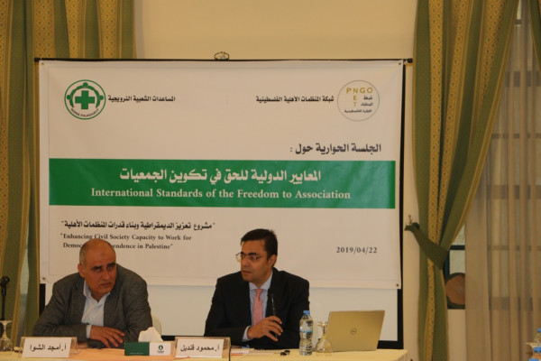 وكانت الجلسة الحوارية بدأت بكلمة أمجد الشوا مدير شبكة المنظمات الأهلية في قطاع غزة تحدث فيها عن الحق في تشكيل الجمعيات والانتهاكات التي يتعرض لها هذا الحق.