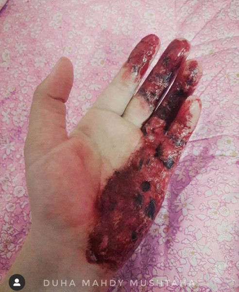 وأضافت: "كانت البداية صعبة جداً لكنها رائعة وعلمتني كثيراً، بدأت بعمل بسيط وغير متقن أبداً ، رسمت على يدي حرق بمستحضرات تجميل عادية ،ولكن مع إصراري بدأت اتقن هذه الفن وبدعم أهلي وأصدقائي لي قد تغيرت النتائج للأفضل دوما".