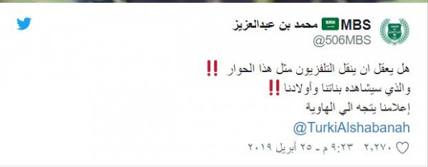 ونشر مغرد سعودي شهير يدعى محمد بن عبدالعزيز، موجهًا لوزير الإعلام السعودي تركي شبانة: "هل يعقل أن ينقل التلفزيون مثل هذا الحوار الذي ستشاهده بناتنا وأولادنا، إعلامنا يتجه إلى الهاوية".