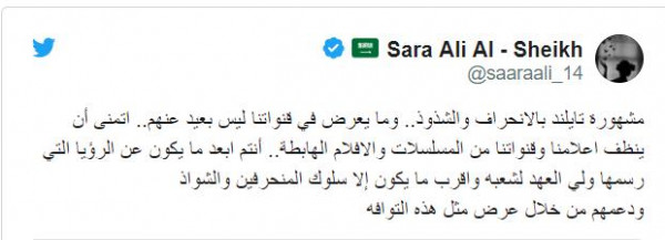 وقالت الكاتبة والمدونة السعودية، سارة علي آل الشيخ، في تعليق على المشهد: "مشهورة تايلند بالانحراف والشذوذ.. وما يعرض في قنواتنا ليس بعيدًا عنهم.. أتمنى أن ينظف إعلامنا وقنواتنا من المسلسلات والأفلام الهابطة.. أنتم أبعد ما يكون عن الرؤيا التي رسمها ولي العهد لشعبه، وأقرب ما يكون إلى سلوك المنحرفين والشواذ ودعمهم من خلال عرض مثل هذه التوافه".
