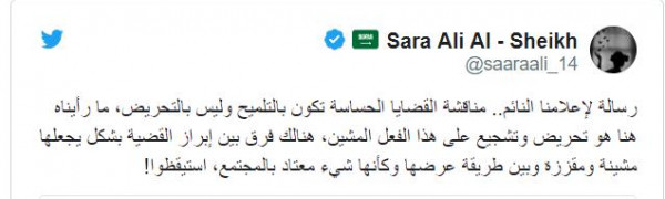 وأضافت في تغريدة أخرى: "رسالة لإعلامنا النائم.. مناقشة القضايا الحساسة تكون بالتلميح وليس بالتحريض، ما رأيناه هنا هو تحريض وتشجيع على هذا الفعل المشين، هنالك فرق بين إبراز القضية بشكل يجعلها مشينة ومقززة وبين طريقة عرضها وكأنها شيء معتاد بالمجتمع، استيقظوا!".